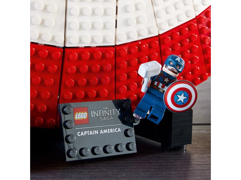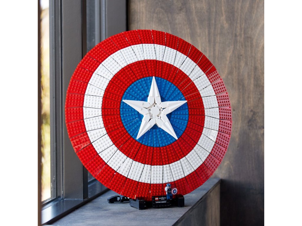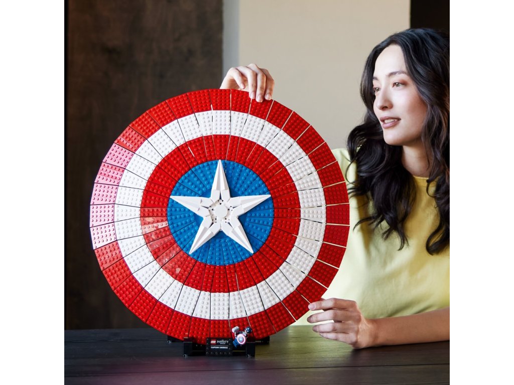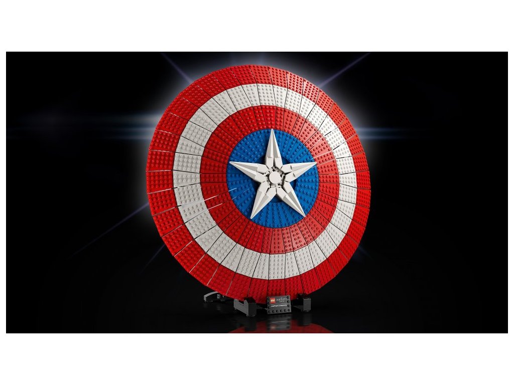 - Připravený k vystavení – Štít je umístěn na podstavci s jmenovkou a součástí je minifigurka Kapitána Ameriky s vlastním štítem a Thorovým kladivem Mjölnirem