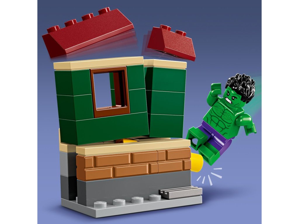 - Dobrodružná akční stavebnice – Děti mohou aktivovat funkci, která zřítí budovu (což se stává často, když je Hulk poblíž!) a pak ji znovu postaví, právě včas na Hulkův další výbuch