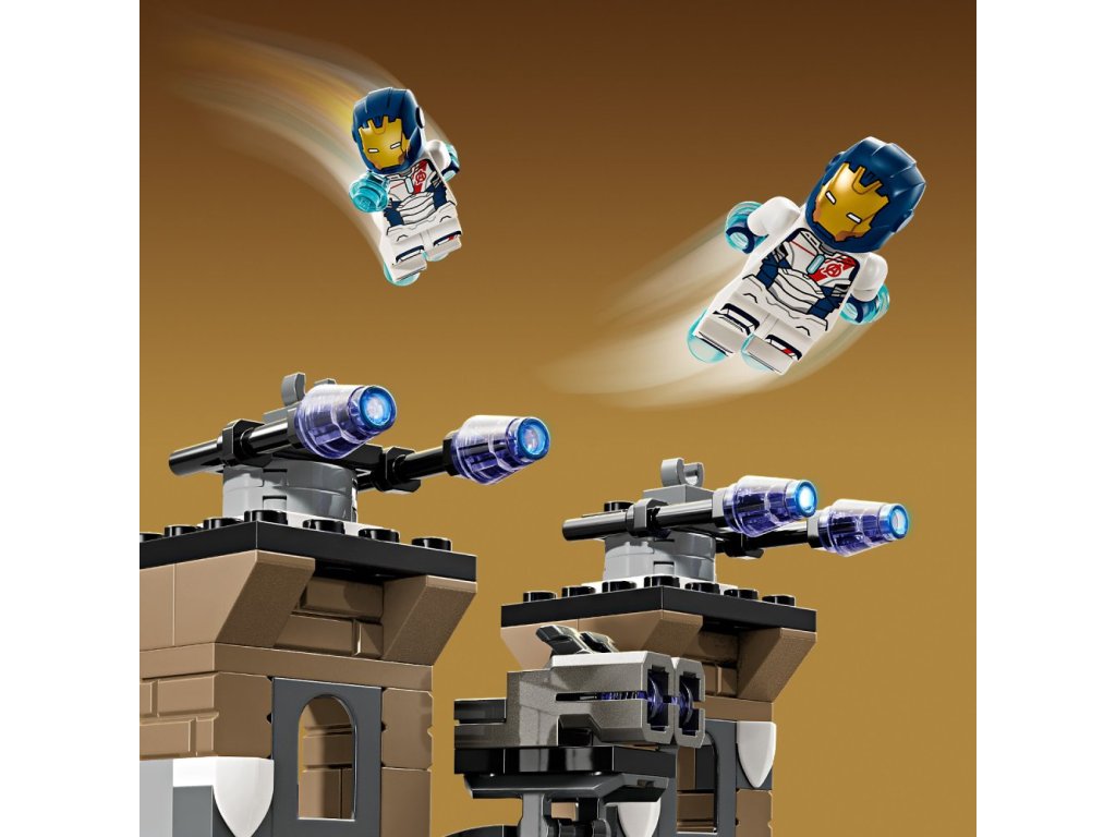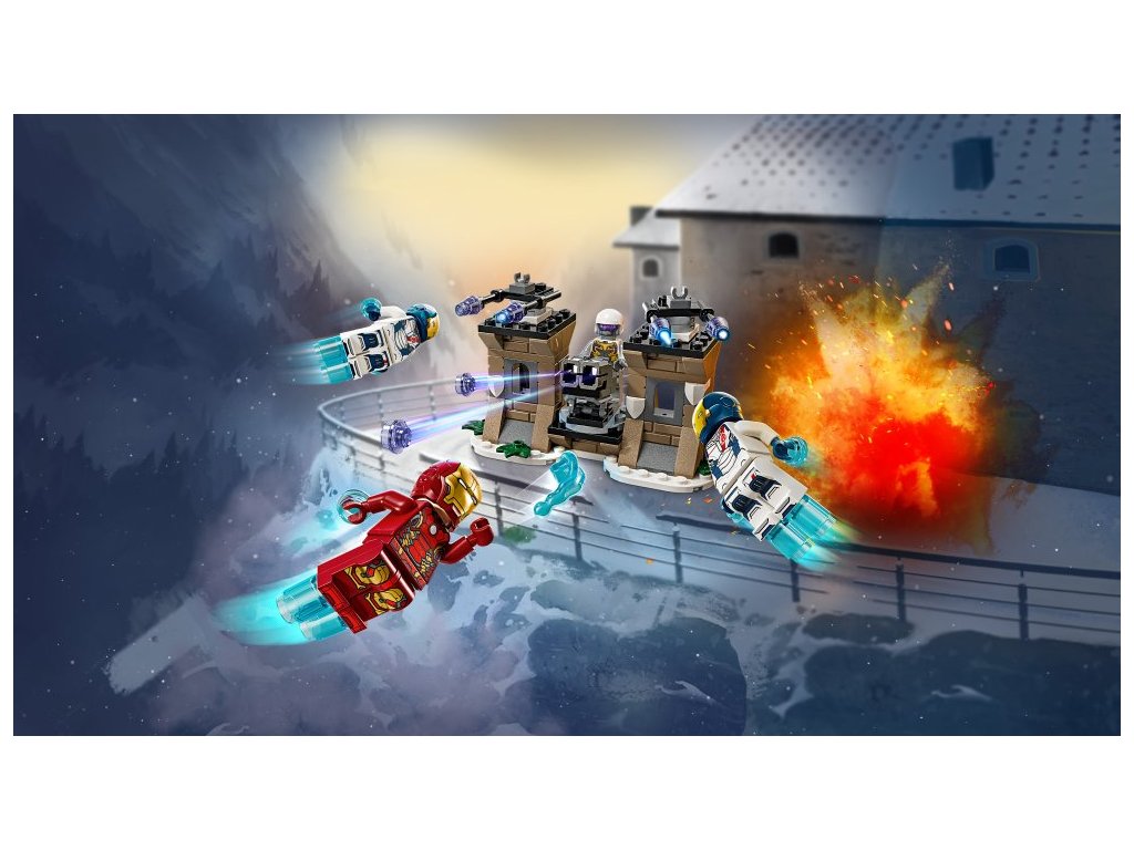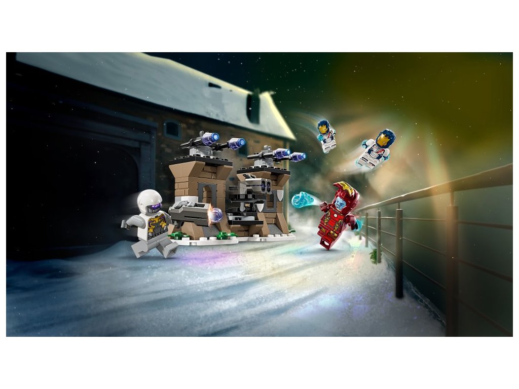 Stavebnice obsahuje 4 minifigurky: Iron Mana, 2 Železné legionáře, a vojáka Hydry. Sestavitelný model Iron Mana má otevírací hledí a drží energetický blaster. Voják Hydry má vystřelovač. Součástí jsou jasně modré kostky, které vytvářejí dojem, že minifigurky létají. Sestavitelný model základny Hydry zahrnuje 2 vystřelovače připevněné k otočné podlaze, kam mohou děti postavit vojáka Hydry, aby mířil na přicházející superhrdiny.Na vrcholu věží základny jsou 2 páry odpalovačů raket (nestřílejících) k odvrácení útoku. K doplňkovým digitálním funkcím se dostanete prostřednictvím aplikace LEGO Builder.