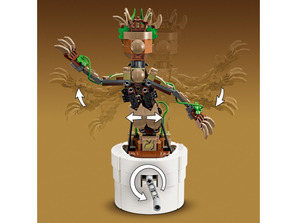 - Interaktivní tančící Groot – Když děti otočí držadlem na zadní straně sestavitelného modelu, kloubový Groot se pořádně rozjede