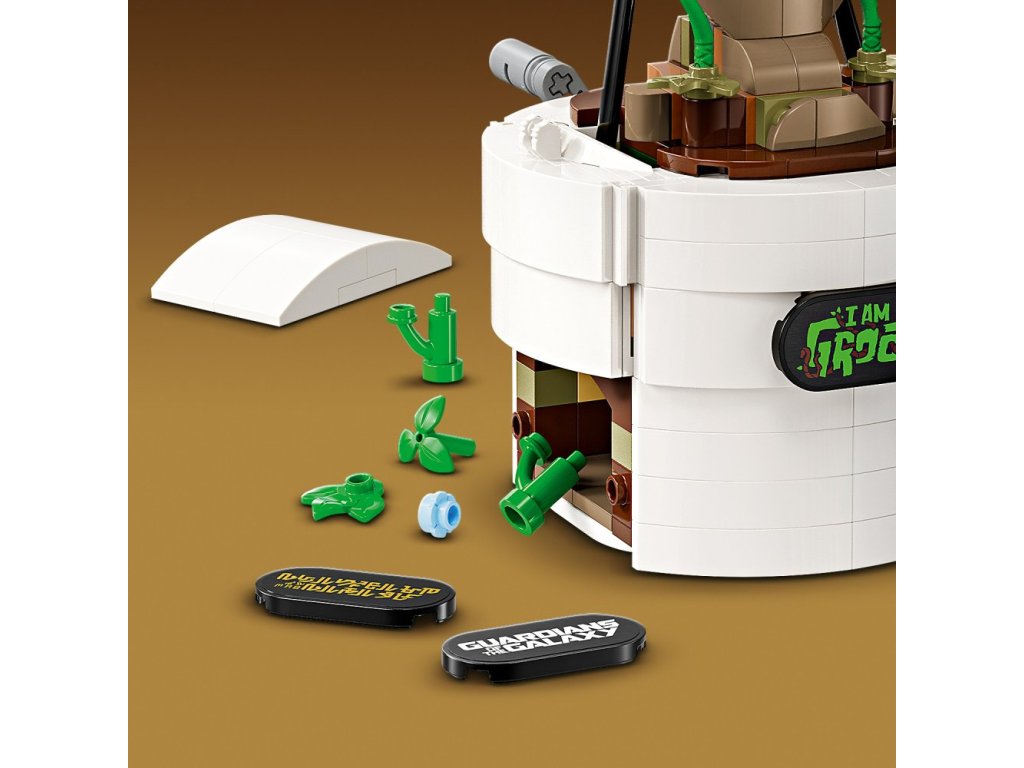 - Stavebnice se superhrdinou – Groot otáčí hlavou a má pohyblivé paže, květináč obsahuje vestavěnou úložnou přihrádku na veškeré doplňky