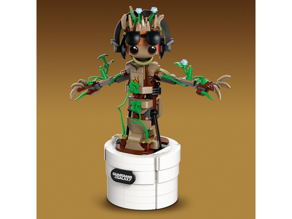 Model Groota pro děti má pohyblivou hlavu a pohyblivé paže. Když děti otočí držadlem na zadní straně květináče, kloubový Groot začne tančit. Figurku lze přizpůsobit pomocí doplňkových listů, sestavitelných sluchátek a slunečních brýlí a děti si mohou přizpůsobit Grootův květináč přidáním 1 ze 3 různých popisků na přední stranu (včetně jedné související s televizním seriálem Já jsem Groot). Veškeré toto příslušenství lze uložit do vestavěné přihrádky květináče. Aby bylo stavění modelu ještě zábavnější, aplikace LEGO Builder dětem umožňuje přibližovat a otáčet modely ve 3D a průběžně sledovat postup stavění.
