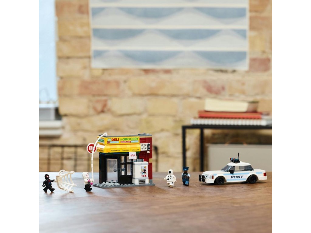 Stavebnice se Spider-Manem obsahuje 4 minifigurky: Milese Moralese, Fleka, Gwen Stacyovou a strážníka Jeffersona. Samoobsluha má zeď s funkcí výbuchu, která umožňuje vyjmutí bankomatu. Mezi doplňky najdete dlouhé, pružné pavučinové lano a pružnou pavučinu, do které se vejde i minifigurka. Policejní auto lze otevřít a dovnitř umístit 2 minifigurky. Stavitelé můžou přibližovat a otáčet modely ve 3D a sledovat svůj pokrok pomocí zábavné a intuitivní aplikace LEGO Builder pro ještě větší porci digitální zábavy.