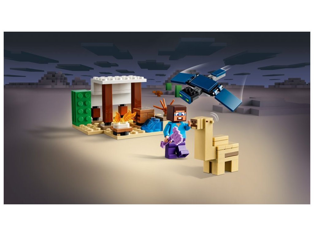 V této přestavitelné herní stavebnici pro děti od 6 let najdete 3 figurky LEGO Minecraft, včetně Stevea, a domek v poušti. Součástí sady jsou také proslulé prvky ze hry Minecraft, jako je pracovní stůl, táborák a řada dílků pro sestavení pouště. Jedná se o skvělý dárek pro fanoušky Minecraftu, který přímo vyzývá k tvořivým dobrodružstvím a akčním bitvám, když základnu napadne létající Přízrak s pohyblivými křídly. Zcela poprvé se ve stavebnici LEGO Minecraft objevuje mládě velblouda a nechybí ani nová verze Steveovy tváře. Sadu lze kombinovat s dalšími stavebnicemi z řady LEGO Minecraft (prodávají se samostatně) a představuje skvělý dárek pro děti i milovníky videoher.