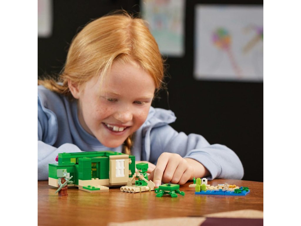 Postavte si Minecraft domek ve tvaru želvy, kterému nechybí okna, lucerny, dveře, stolek, pracovní stůl a pec. Odklápěcí střecha umožňuje snadný přístup dovnitř. Venku najdete pláž s cukrovou třtinou, želvími vejci a bambusovým vorem s pádly. Nechybí oblíbené postavy a mobové z Minecraftu: želví válečník v želvím skinu a helmě, utopenec s trojzubcem, želva uždibující mořskou trávu a 3 želví mláďata. Mezi další doplňky této stavebnice patří také dalekohled a mapa. Tuto různorodou sadu si zamilují fanoušci videoher, tvůrčího stavění a péče o zvířata. S aplikací LEGO Builder se můžete těšit na zábavný digitální zážitek navíc. V ní si lze přibližovat a otáčet modely ve 3D a sledovat postup.