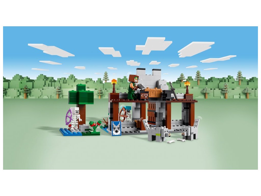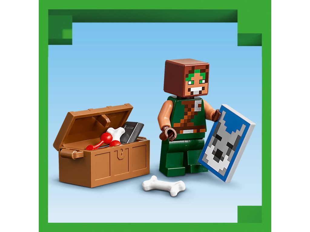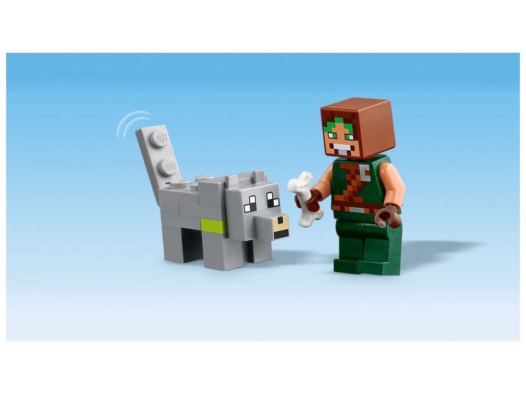 Děti si postaví základnu krotitelů vlků s velkou vlčí hlavou nad vchodem. Poté se zabaví vyměňováním výrazu tváře vlka z přátelské na rozzlobenou. Uvnitř najdete stůl na tvoření, vysokou pec, kovadlinu a zcela poprvé ve stavebnici LEGO Minecraft také kovářský stůl. V truhle se zásobami najdete netheritový ingot, ze kterého děti mohou vyrobit meč, sladké plody a kosti, které zkrotí divokého vlka. Venku se nachází část lesa se stromem, balvanem, houbou a keříkem s bobulkami. Po lese se potulují 2 figurky kostlivců ze světa Minecraft – jeden se začarovaným lukem a druhý s lukem, šípem a diamantovou přilbou. Více digitální zábavy stavitelé najdou v intuitivní aplikaci LEGO Builder.
