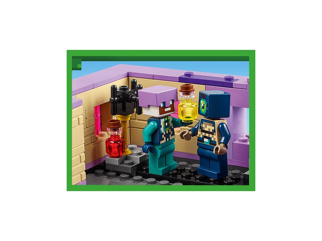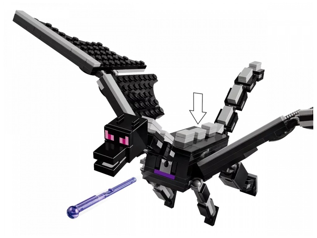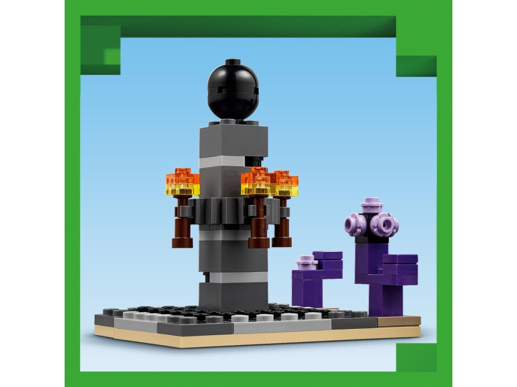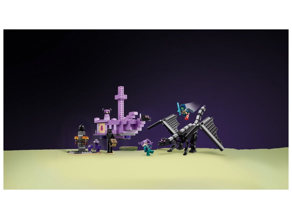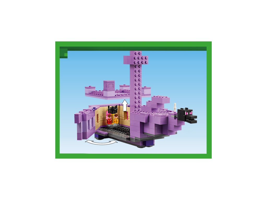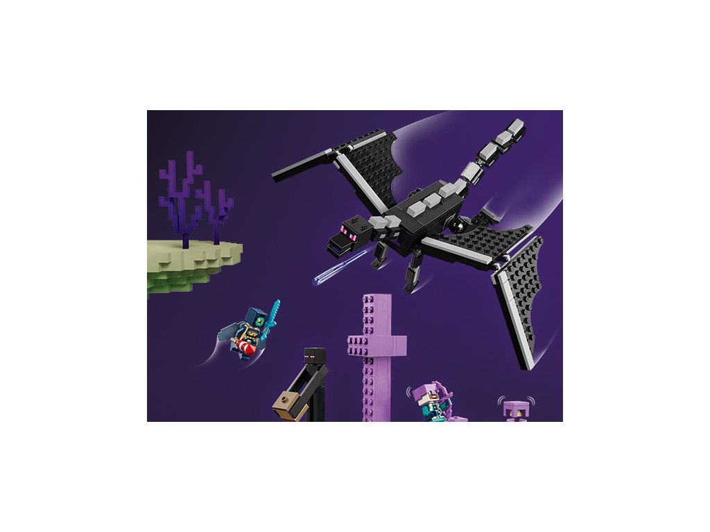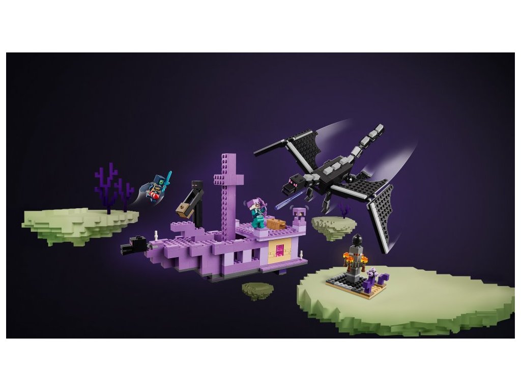 Hráči vstoupí do nebezpečného biomu End, kde se musí postavit drakovi z Enderu. Všechny končetiny této figurky s klouby jsou pohyblivé a upravitelné. Loď z Endu má plně vybavený interiér, do kterého vstoupíte skrz zvedací střechu a otevírací boční strany. Dračí hlavu z přídě lze odejmout a nosit ji jako přilbu. Uvnitř děti najdou varný stojan s lektvary zdraví. Mezi postavy z Minecraftu najdete průzkumníka Enderu s krovkami a ohňostrojovou raketou, rytíř zEnderu, Shulker a Enderman. Součástí je také cenné dračí vejce. Více digitální zábavy si stavitelé užijí s interaktivní aplikací LEGO® Builder, ve které mohou přibližovat a otáčet modely ve 3D a sledovat svůj pokrok.