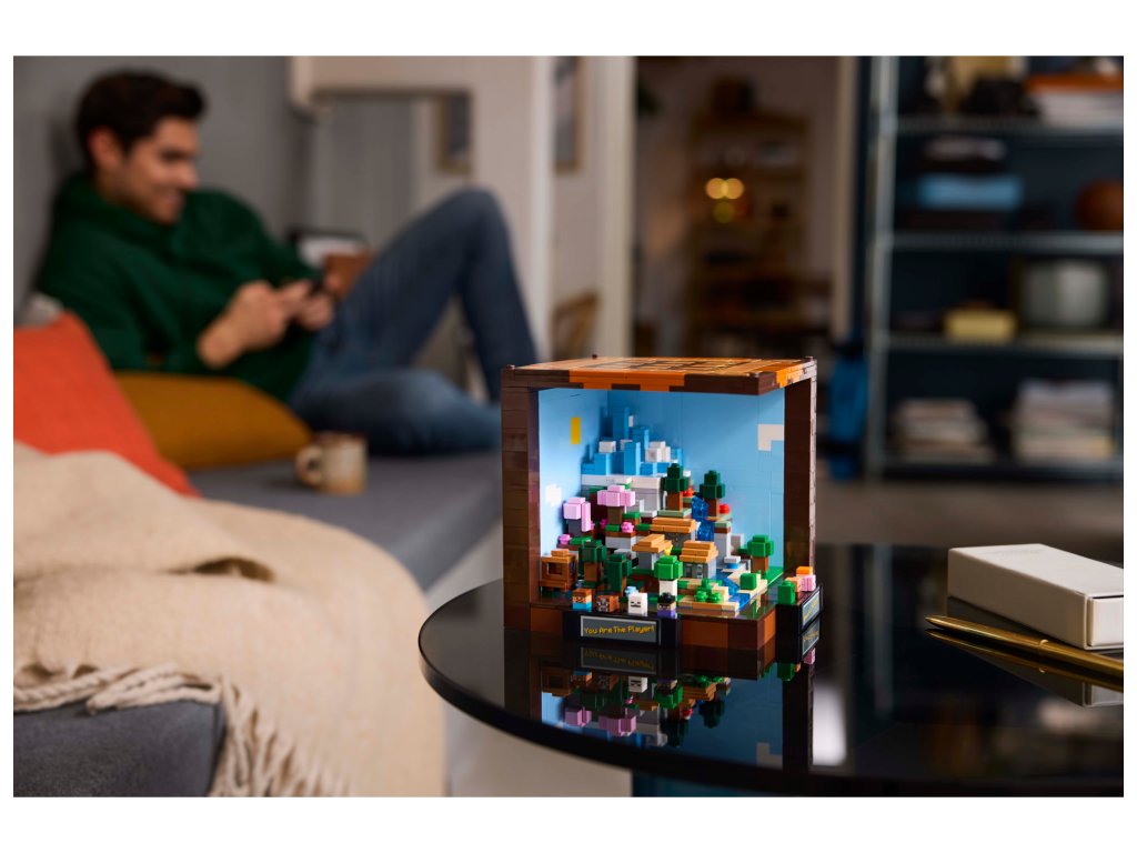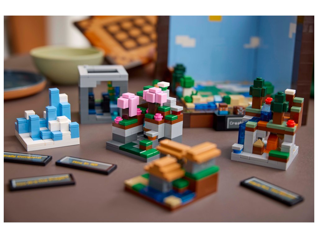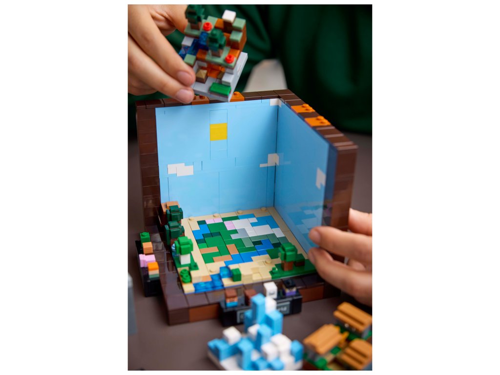 Tato stavebnice ztvárňuje legendární pracovní stůl z oblíbené videohry. Součástí je 5 mini modelů s 12 biomy z Minecraftu, včetně tajgy s krápníkovou jeskyní, pláně s vesnicí, ledových hrotů s iglú, třešňového háje s opuštěnou důlní šachtou a Deep Dark se zarostlou jeskyní. Nechybí 8 mikrofigurek: Steve, Alex, kostlivec, čarodějnice, Creeper™, vesničan, kráva a prase. Mini modely a mikrofigurky lze odpojit od hlavního modelu a stavebnici si tak upravit a vystavit různými způsoby. Na přední stranu tohoto modelu inspirovaného Minecraftem lze nalepit samolepky se známými hláškami ze hry. Aplikace LEGO Builder obsahuje digitální verzi návodu na stavění, který je součástí stavebnice.