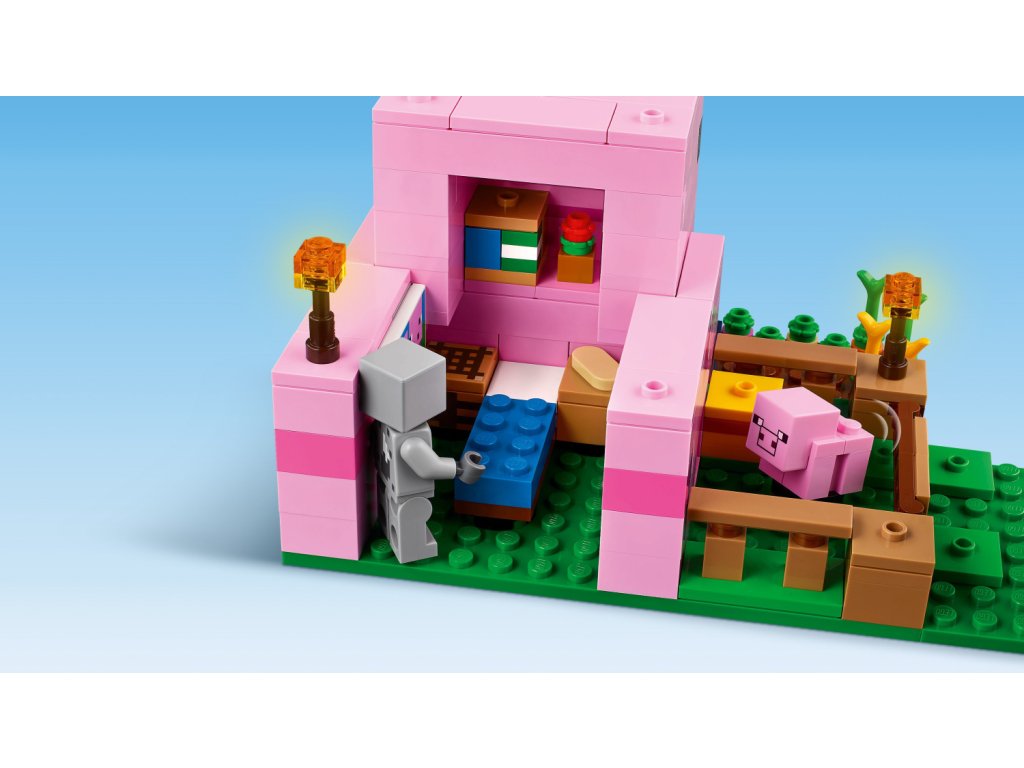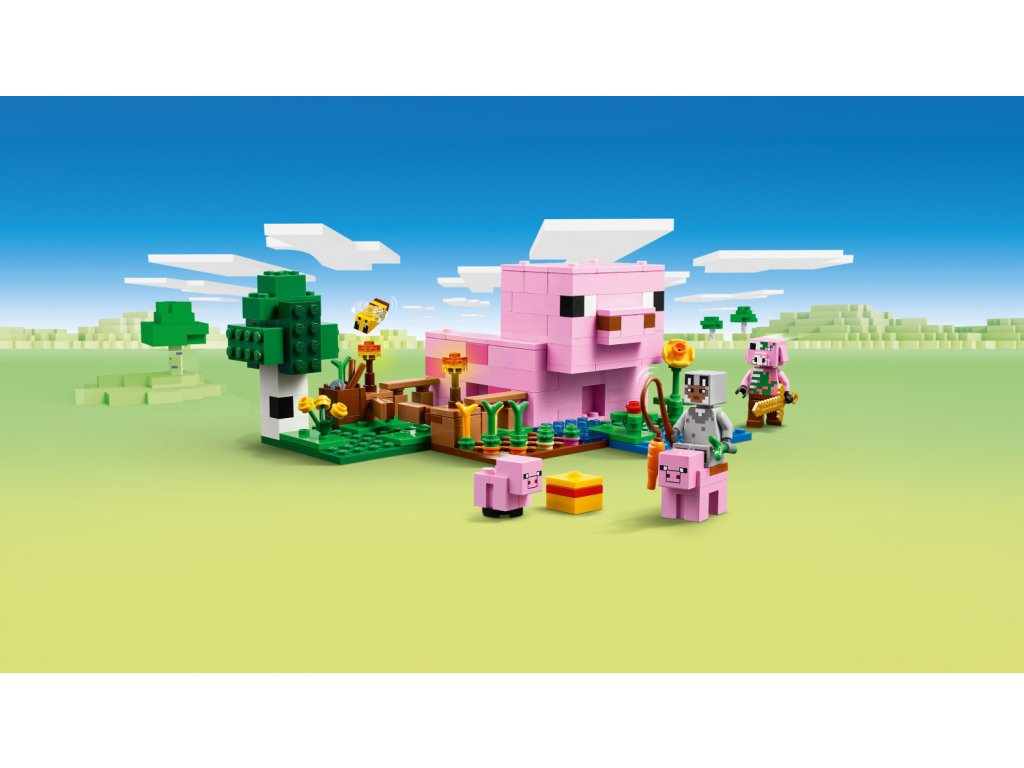 - LEGO® Minecraft® Domeček Prasátka – Děti postaví domeček ve tvaru prasátka, jehož součástí je políčko, na kterém rostou brambory a řepa, pole s bránou, kterou provedou prasátko, a spousta dalšího
