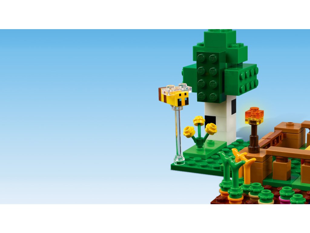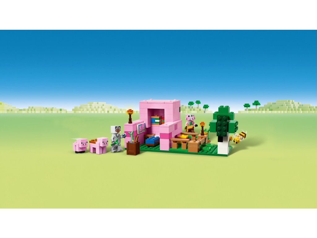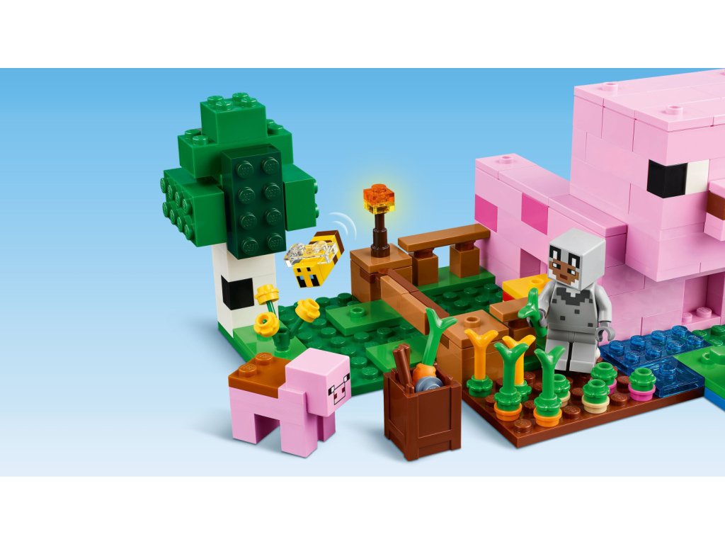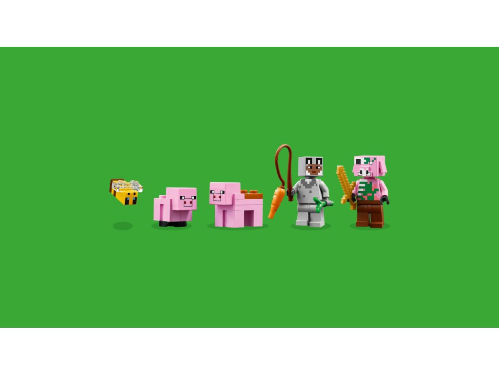 Tato kreativní stavebnice se odehrává v lesním biomu světa hry Minecraft. Součástí je řada figurek z této oblíbené videohry: Postava hrdiny ve vlčím skinu, prasátko, včelu, dospělé prase a zombifikovaného piglina. Děti si připomenou momenty ze hry – můžou například osedlat dospělé prase a pověsit nad něj mrkev, aby se projely kolem zahrady a domu v podobě prasete. Součástí je políčko, kde děti vypěstují brambory a řepu, a pole s bránou, skrz kterou provedete prasátko. Děti se vyhnou zombifikovanému piglinovi, který jim chce zkazit zábavu – stačí vstoupit do domu, kde najdou postel, knihovnu a pracovní stůl, které inspirují k nápaditému hraní. Aplikace LEGO® Builder dětem přináší další zábavu a pomocí svého zařízení v ní můžou přibližovat a otáčet modely ve 3D.