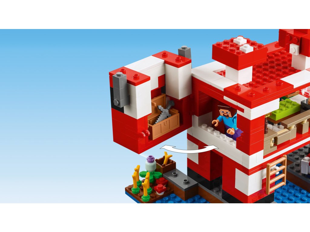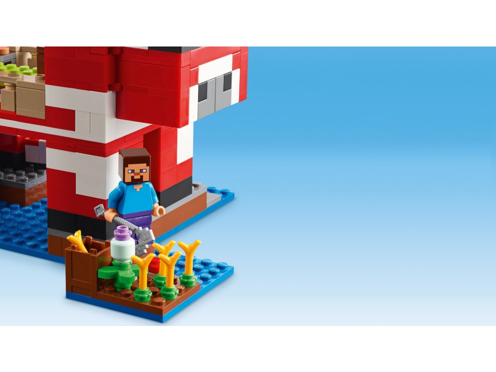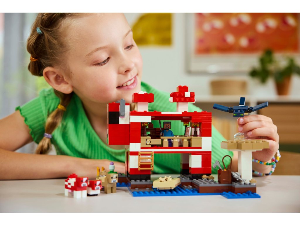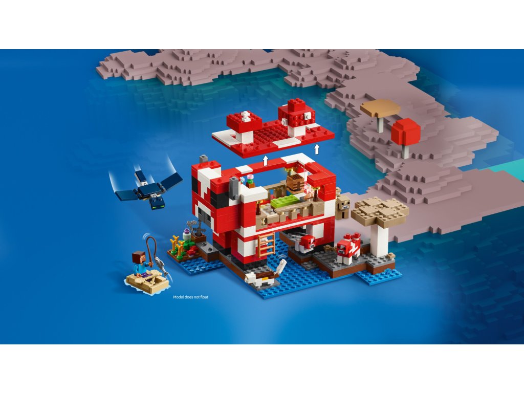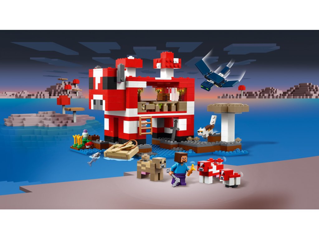 Tato stavebnice LEGO Minecraft se nachází na houbovém ostrově a obsahuje oblíbenou postavu Steva, červenou krávomůrku, malou červenou krávomůrku, hnědou krávomůrku, tříbarevnou kočku a nepřátelský létající přízrak. Stavebnice je plná prvky, které se objevují ve hře, včetně malé farmy s pšenicí, houbami a rostliny rostoucí vedle kompostéru. Mezi doplňky najdete rybářský prut, tresku, motyku, netheritový meč, misku, loďku s vesly, truhlu, pec, pracovní stůl, knihovnu, chléb a postel. S aplikací LEGO Builder si děti užijí ještě větší porci zábavy. Umožní jim na jejich zařízení přibližovat a otáčet modely ve 3D.