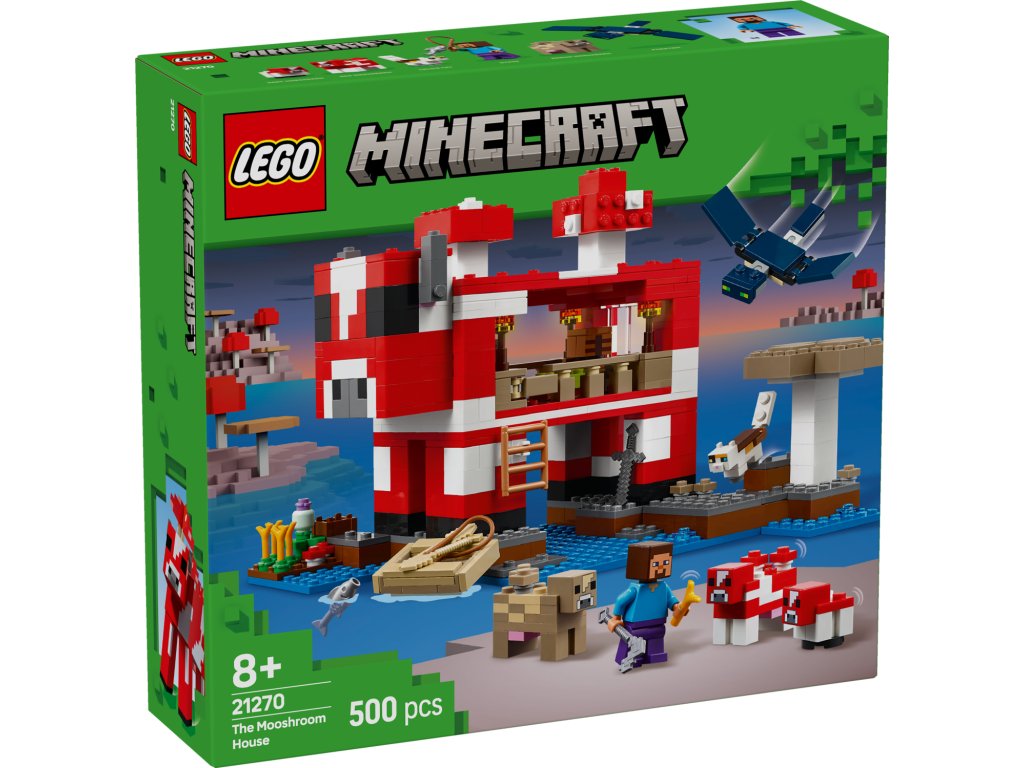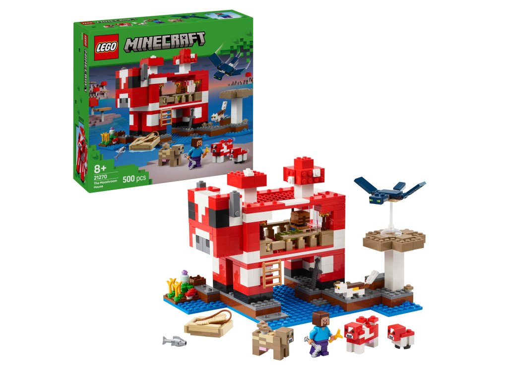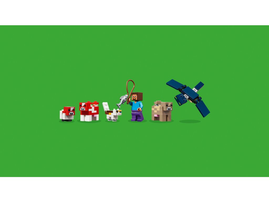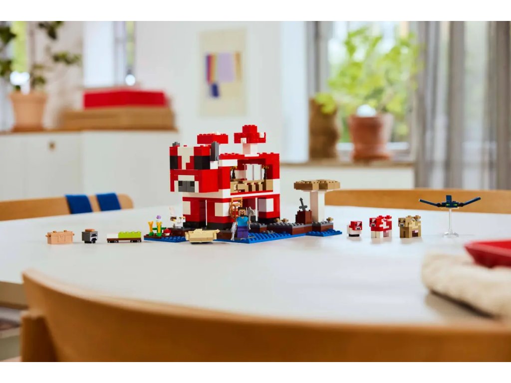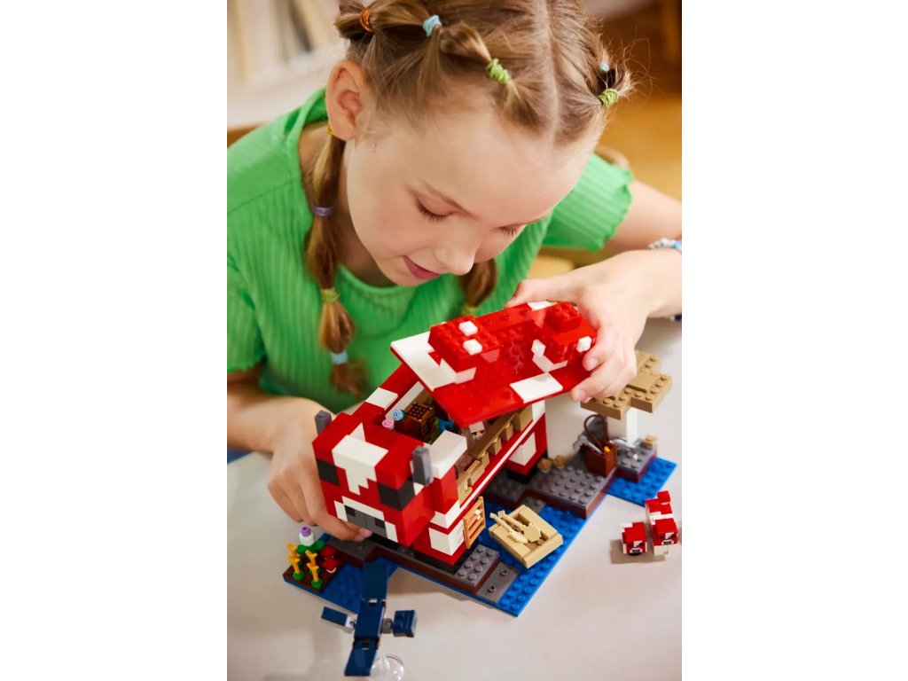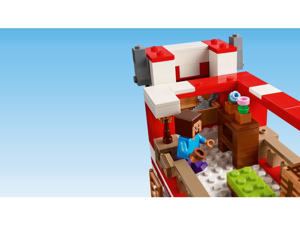 Tato stavebnice LEGO Minecraft se nachází na houbovém ostrově a obsahuje oblíbenou postavu Steva, červenou krávomůrku, malou červenou krávomůrku, hnědou krávomůrku, tříbarevnou kočku a nepřátelský létající přízrak. Stavebnice je plná prvky, které se objevují ve hře, včetně malé farmy s pšenicí, houbami a rostliny rostoucí vedle kompostéru. Mezi doplňky najdete rybářský prut, tresku, motyku, netheritový meč, misku, loďku s vesly, truhlu, pec, pracovní stůl, knihovnu, chléb a postel. S aplikací LEGO Builder si děti užijí ještě větší porci zábavy. Umožní jim na jejich zařízení přibližovat a otáčet modely ve 3D.