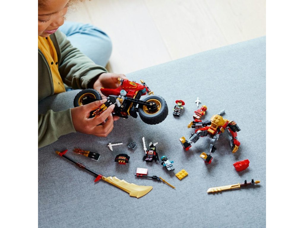 - Nindžovská motorka – Děti a milovníci motorek ve stavebnici Kaiova robomotorka EVO z řady NINJAGO® (71783) najdou vše, co mohou potřebovat k přehrávání napínavých bitev, včetně nindžovské motorky a robota