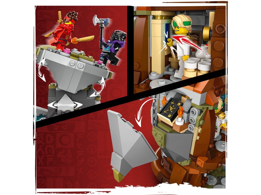 Součástí této nindžovské stavebnice je kamenný drak, tréninkový prostor, který se při boji přesouvá ze strany na stranu, vodopád, rozkvetlá třešeň, knihovna se svitky, knihy a čajovou soupravou, a tajná místnost, kterou odhalíte zatlačením na knihy v knihovně.