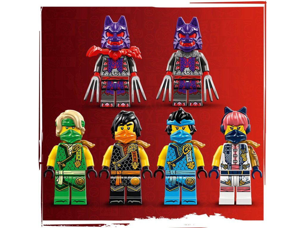 Součástí této stavebnice je 6 minifigurek NINJAGO: Nindžové Sora, Lloyd, Nya a Cole, kteří jsou oblečeni ve speciálním turnajovém brnění a vyzbrojeni katanami, a jejich soupeři, válečník s vlčí maskou a generál ve vlčí masce.