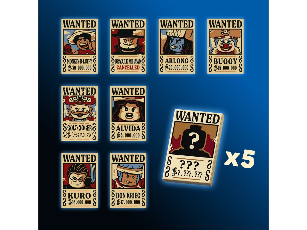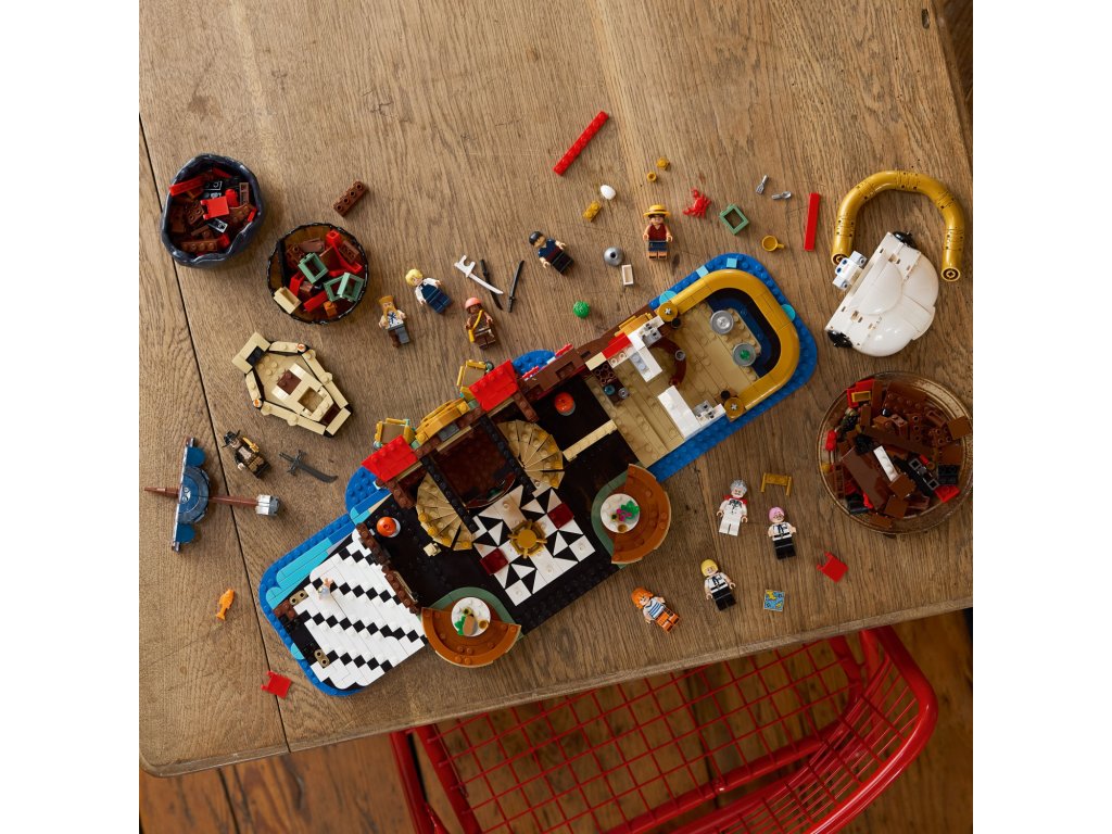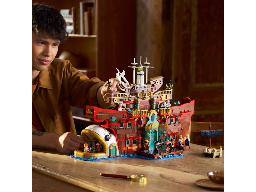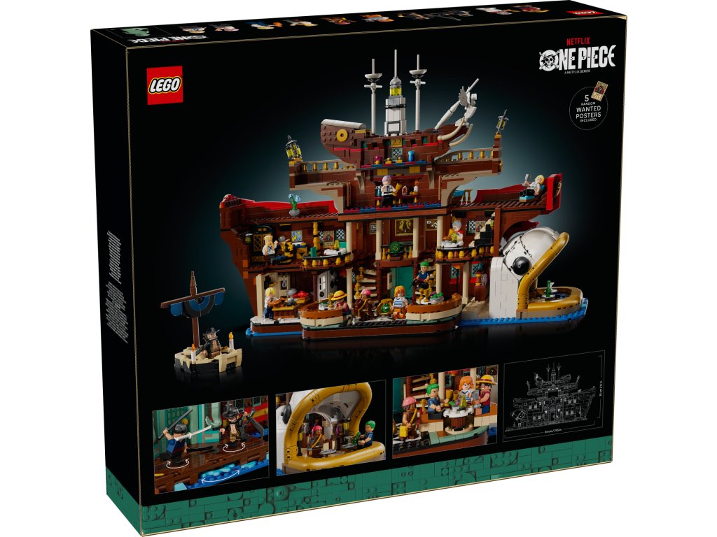 Tento impozantní výstavní kousek ve tvaru lodi obsahuje řadu přístupných místností, včetně kuchyně a jídelny, Zeffovy kajuty a místnosti s pokladem. Připomeňte si klasické scény s 10 minifigurkami LEGO: Luffym, Zorem, Nami, Usoppem, Sanjim, Zeffem, Garpem, Helmeppem, Kobym a Mihawkem. Stavebnice obsahuje také řadu autentických doplňků, včetně 5 plakátů s hledanými osobami. Aplikace LEGO Builder umožňuje uživatelům přibližovat a otáčet modely ve 3D a sledovat postup stavění.