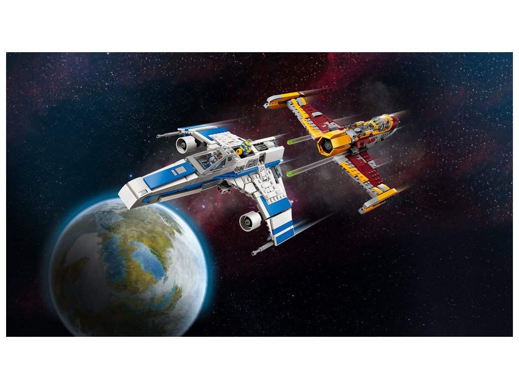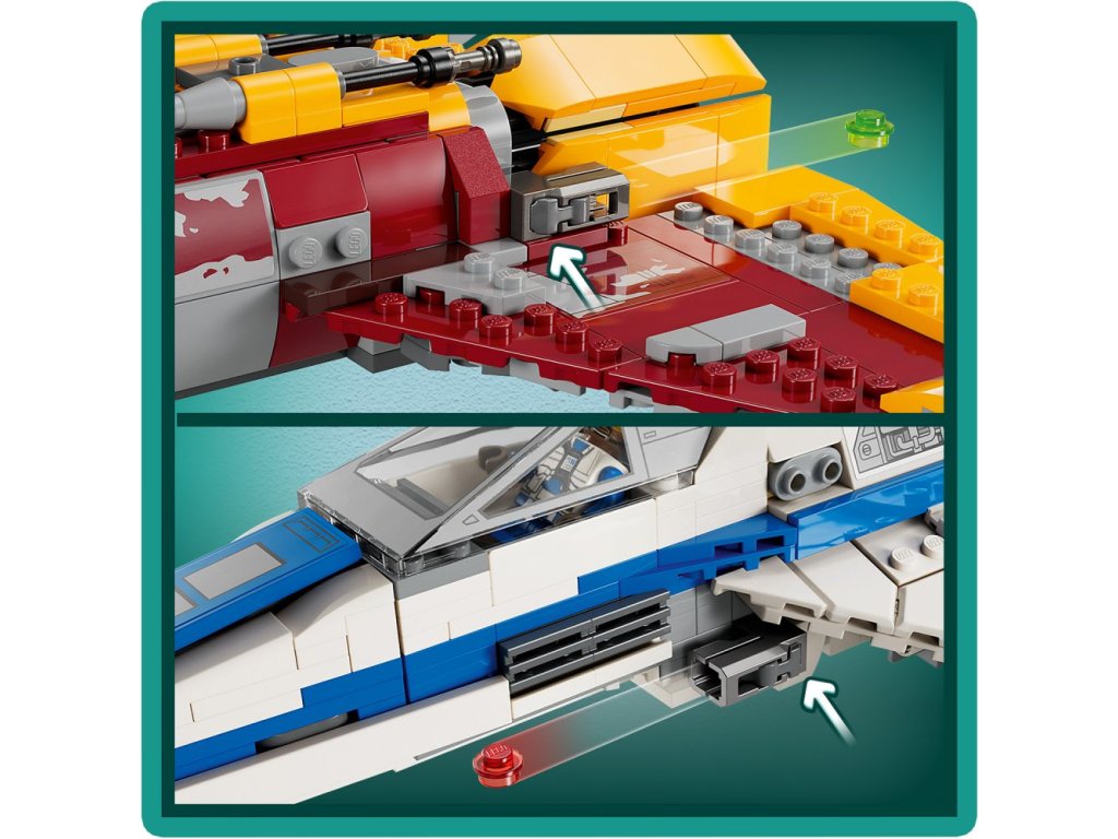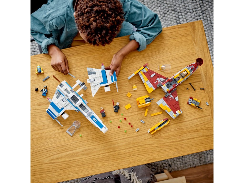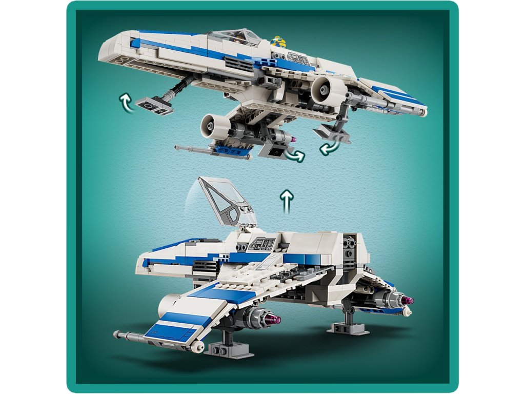 - Stíhačka E-wing™ Nové republiky – Součástí je otevírací kokpit pro minifigurku LEGO®, místo pod sedadlem pro blasterovou pistoli, místo pro droida za kokpitem, 2 vystřelovače a zatahovací podvozek
