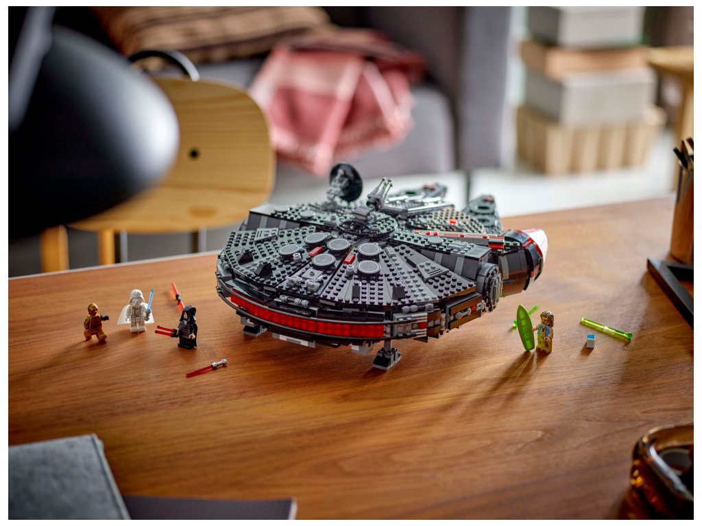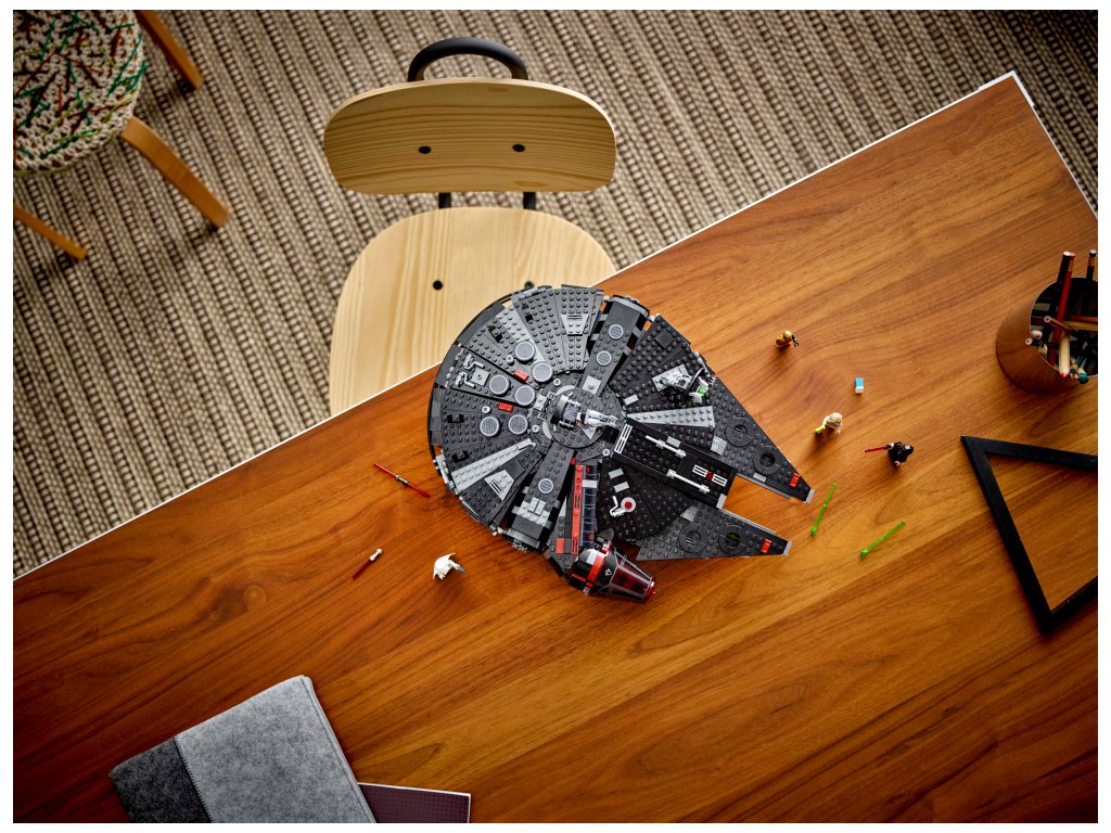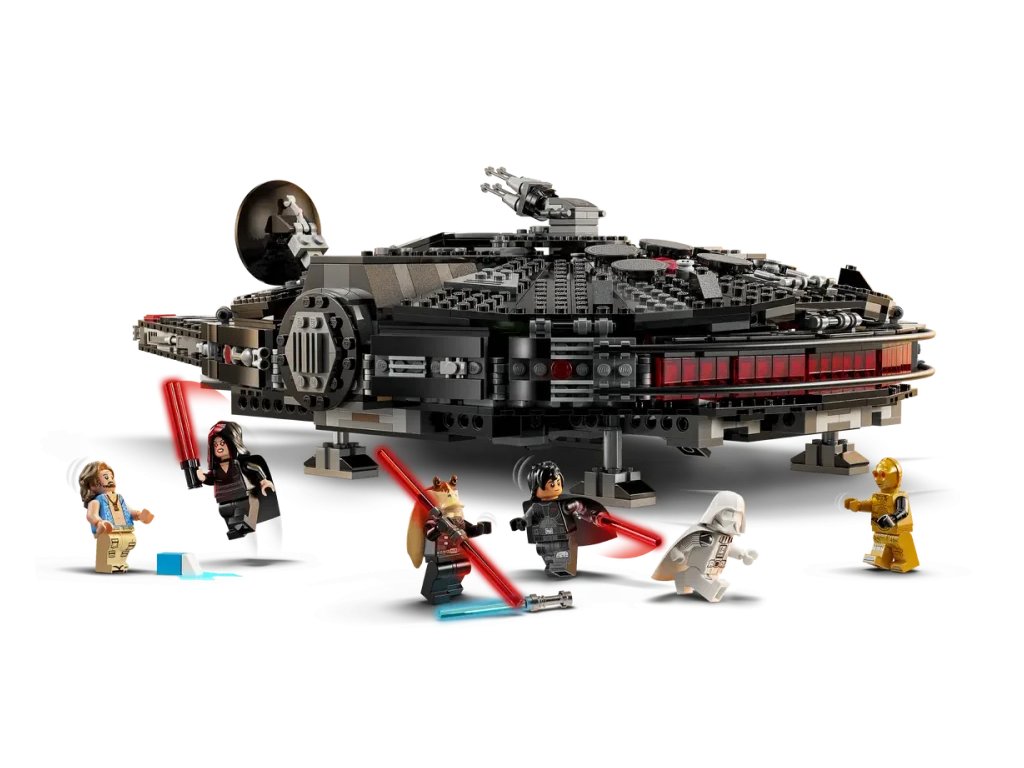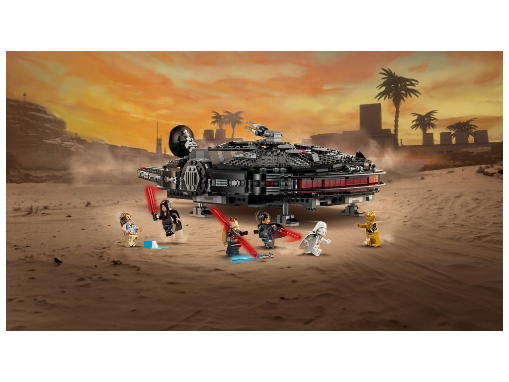 - Temný Falcon z kostek LEGO® – Součástí je odnímatelný kokpit pro 2 minifigurky LEGO, 2 pružinové vystřelovače, 2 otočná děla, střelecké stanoviště pro 2 minifigurky LEGO a satelitní talíř