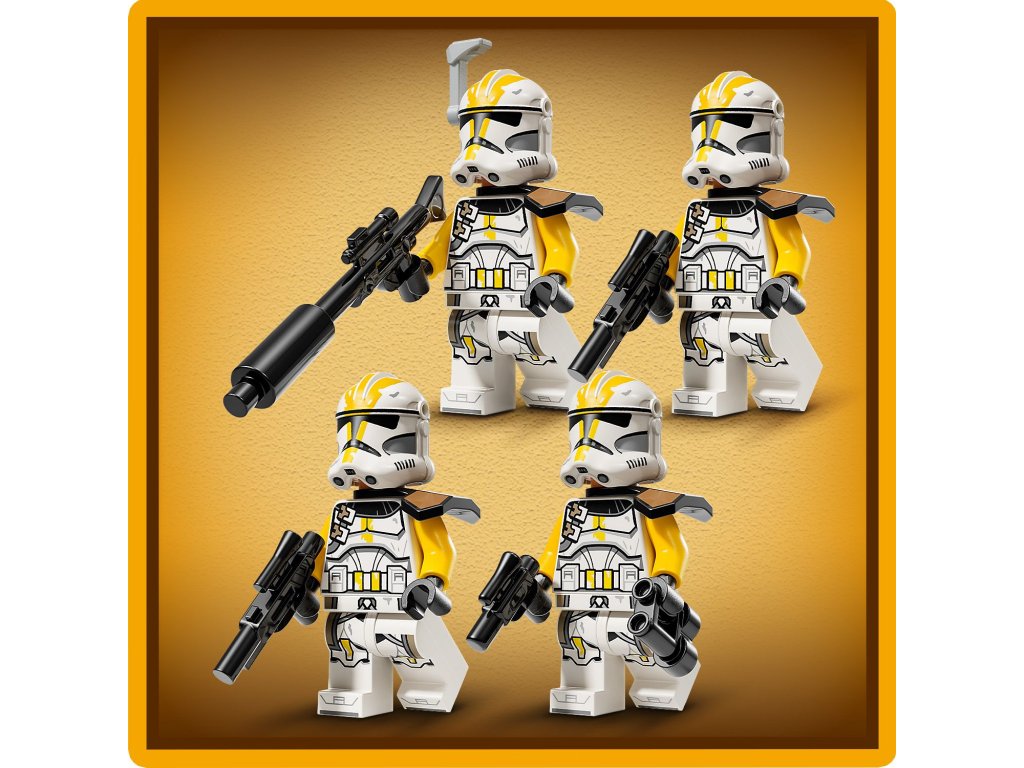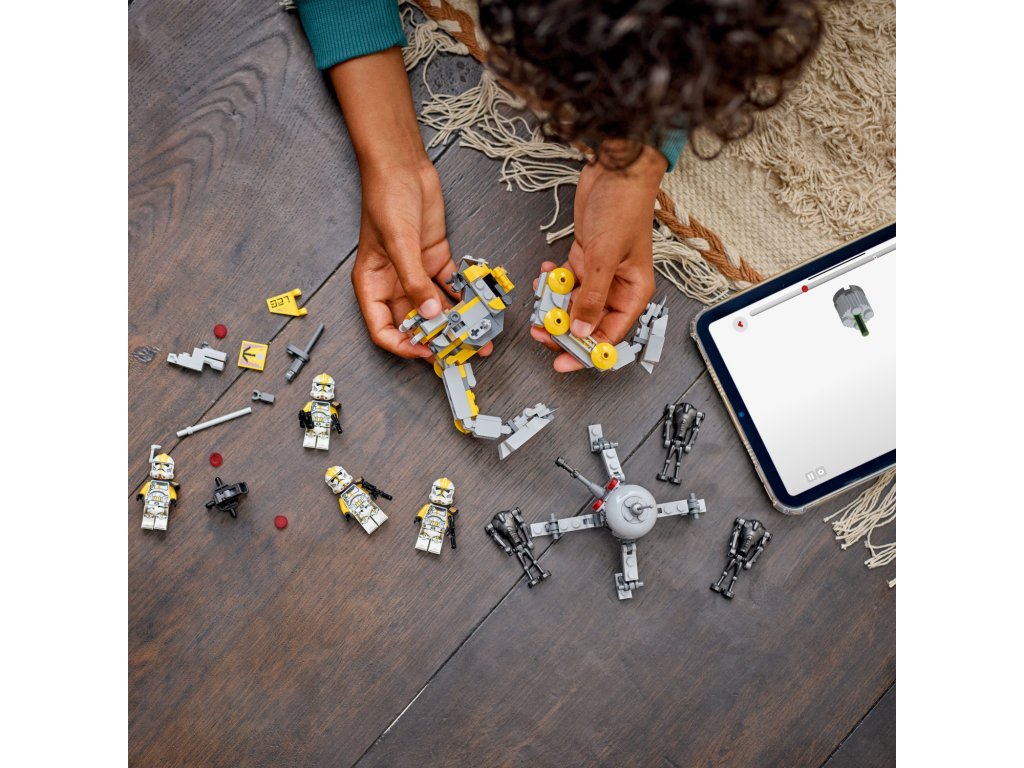 - 4 minifigurky LEGO® Star Wars™ – 4 klonovaní vojáci z 327. legie s blasterovou pistolí, 2 blastery a blasterovou puškou a navíc 3 figurky LEGO super bitevních droidů