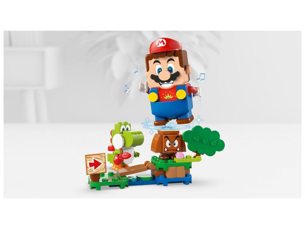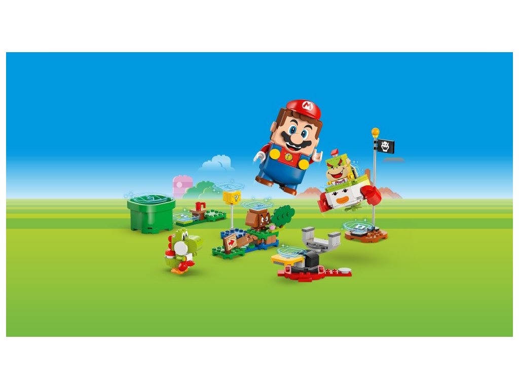 - Dobrodružný set – Začněte na startovacím potrubí, pozdravte Yoshiho, porazte Goombu, dupněte na akční kostku s otazníkem, podejte si Bowsera Jr. a doběhněte k cílové vlaječce