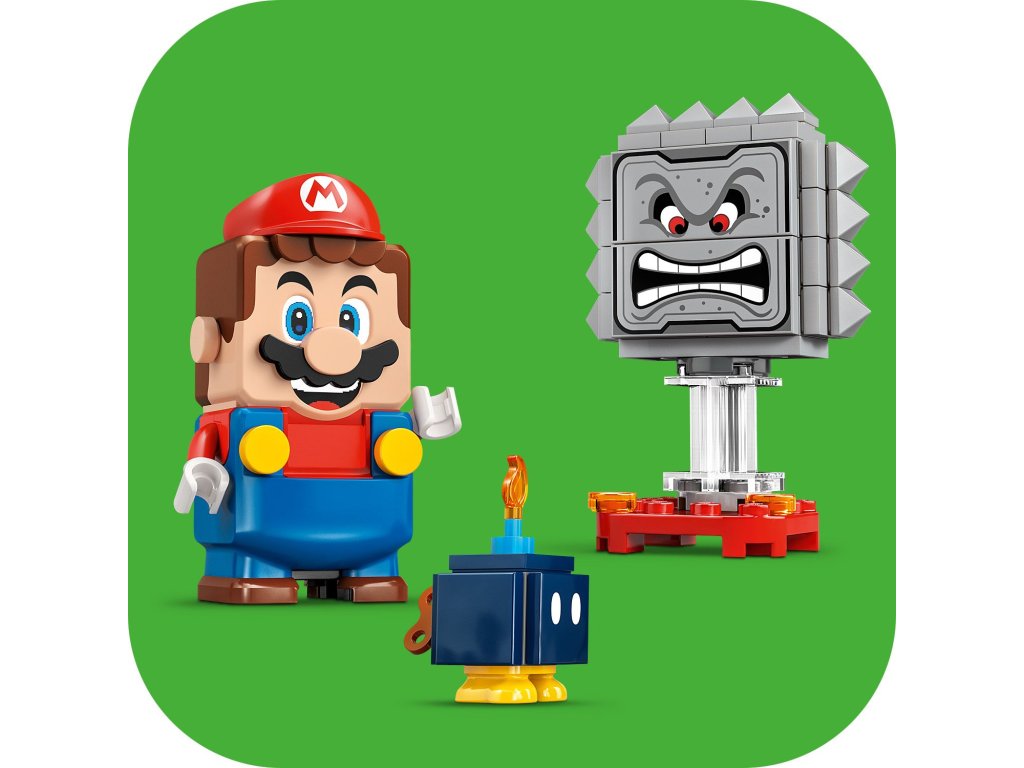 - 3 figurky LEGO® Super Mario™ – Interaktivní figurka LEGO® Mario™, figurka Bob-omba a Thwompa a prvek Banana s obličejem
