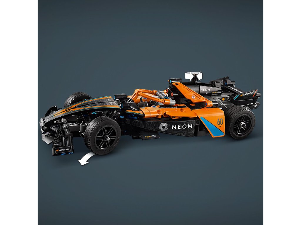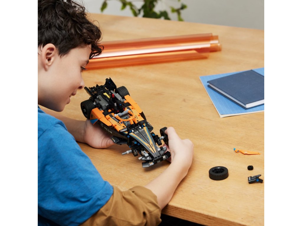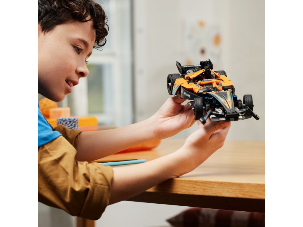 - Vozidlo NEOM McLaren Formula E z natahovacím motorem – S touto stavebnicí pro děti od 9 let si malí milovníci závodů postaví vlastní závodní auto s natahovacím motorem