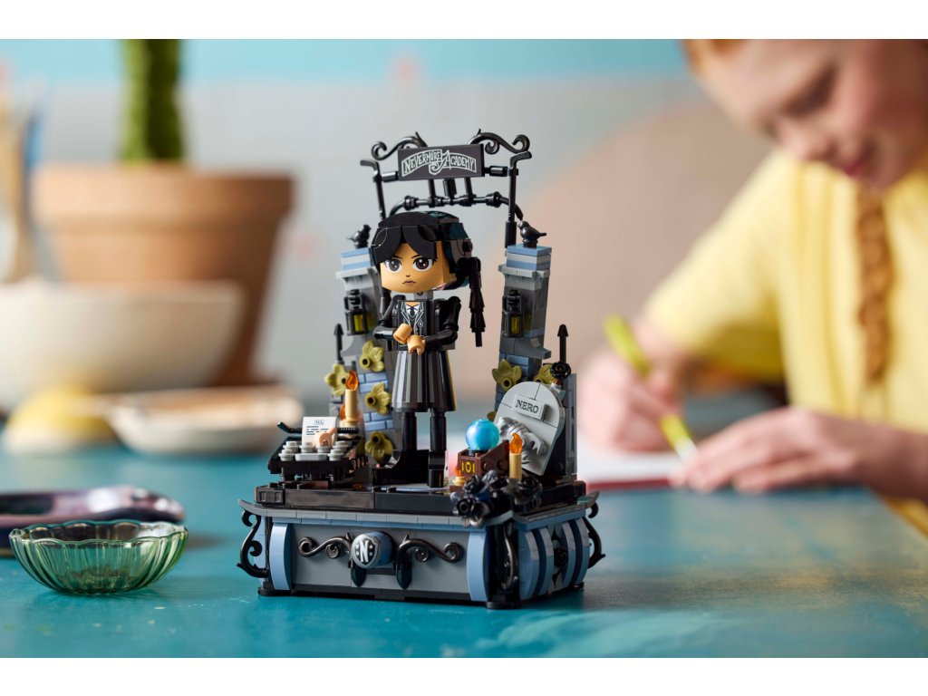 - Hračka akademie Nevermore – Fanoušci televizního seriálu od 10 let si mohou Wednesday postavit v uniformě nebo v šatech z Havranbálu a umístit ji na podstavec