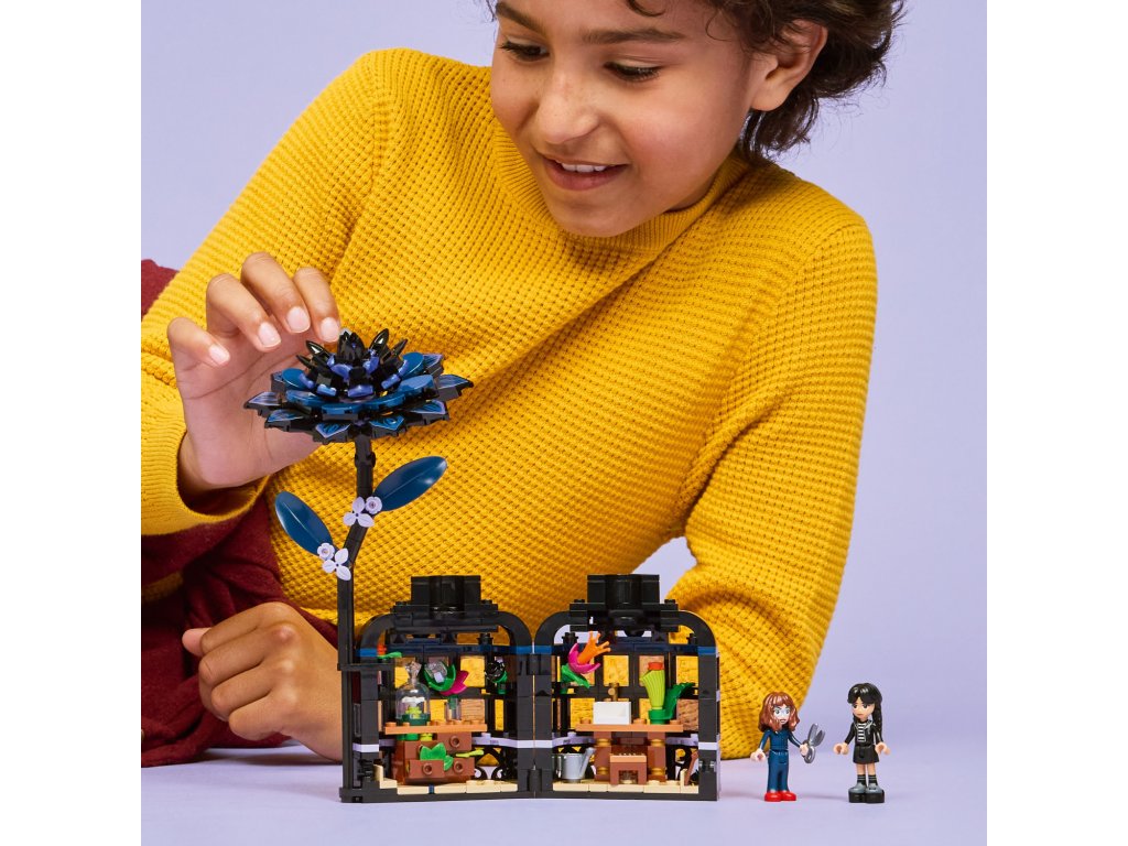 Stavebnice LEGO® Wednesday (76784) Černá jiřina představuje elegantní výstavní kousek pro milovníky botaniky a designu od 9 let. Tato bytová dekorace obsahuje černou jiřinu s listy a světle fialovými pupeny a vázu, která připomíná miniaturní zimní zahradu. Po sestavení můžou děti odejmout květ jiřiny, odemknout vázu a odhalit učebnu uvnitř, ve které najdou odnímatelné lavice, stoličku a další doplňky pro vyprávění příběhů. Součástí stavebnice jsou také minipanenky Wednesday Addamsové a profesorky Marilyn Thornhillové na hraní na postavy.
