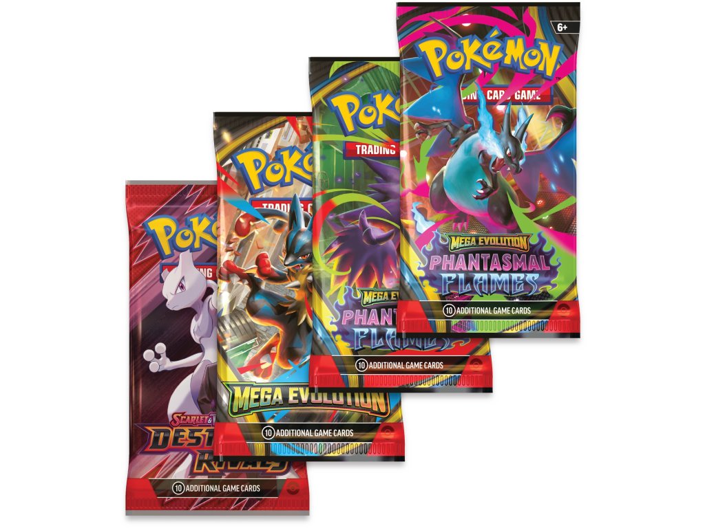 • 4 boostery Pokémon TCG (2x Phantasmal Flames, 1x Mega Evolution, 1x Destined Rivals)