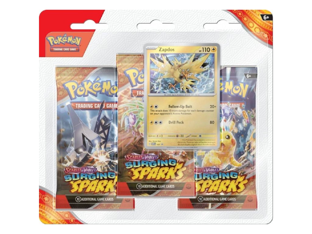 Pokémon TCG: Surging Sparks 3 Booster Blister – Zapdos je sběratelské balení karetní hry Pokémon TCG, které obsahuje tři booster balíčky z edice Surging Sparks a jednu foilovou promo kartu Zapdose. Produkt je vhodný pro hráče i sběratele, kteří chtějí rozšířit svou sbírku o karty z této edice.