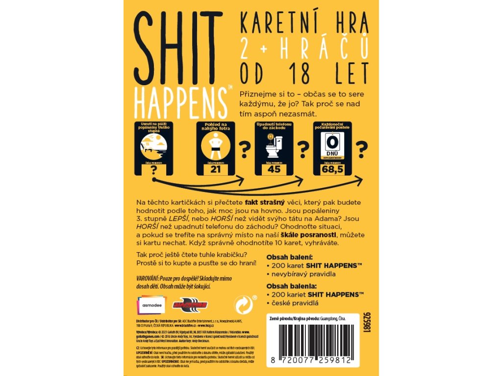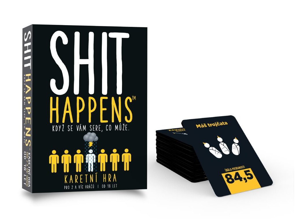 Přiznejme si to - občas se to sere každýmu, že jo? Tak proč se nad tím aspoň nezasmát. Shit Happens je karetní hra pro všechny fanoušky nekorektního humoru.Na kartách si přečtete fakt strašný věci, který pak budete hodnotit podle toho, jak moc jsou na hovno. Jsou popáleniny 3. stupně LEPŠÍ, nebo HORŠÍ než vidět svýho tátu na Adama?
