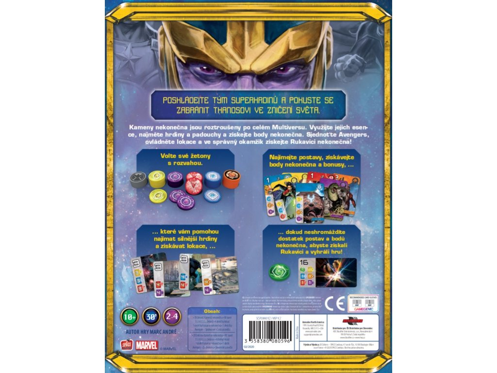 - obsah balení: 39 žetonů Kamenů nekonečna, 90 karet, 5 S.H.I.E.L.D. žetonů, 4 destičky lokací, destička Rukavice nekonečna, destička Avengers – Sjednocení, česká a slovenská pravidla