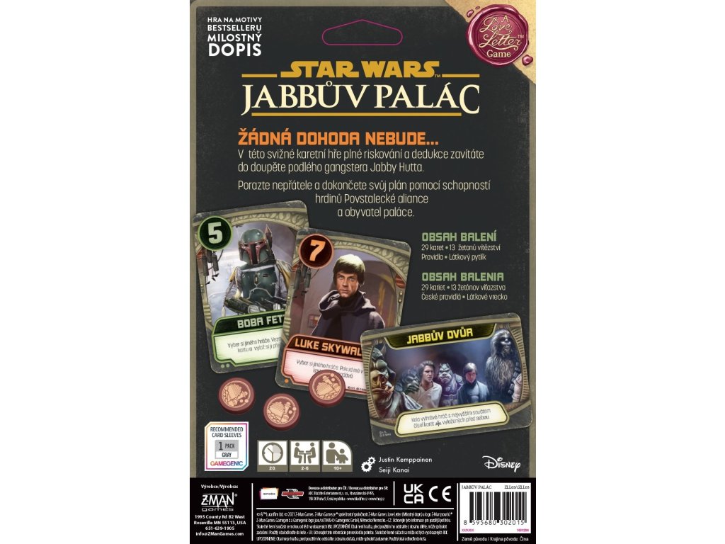 Vítejte v Jabba Huttově paláci. Porazte nepřátele a dokončete svůj plán pomocí schopností hrdinů Povstalecké aliance a obyvatel paláce.Star Wars: Jabbův palác je karetní hra postavená na mechanikách oblíbeného Milostného dopisu, avšak přináší několik nových prvků, které mění hratelnost. Na své si přijdou fanoušci klasické hry i Star Wars licence. Do rukou se vám dostanou ikoničtí hrdinové i záporáci, jako princezna Leia, Han Solo nebo samotný Jabba Hutt.