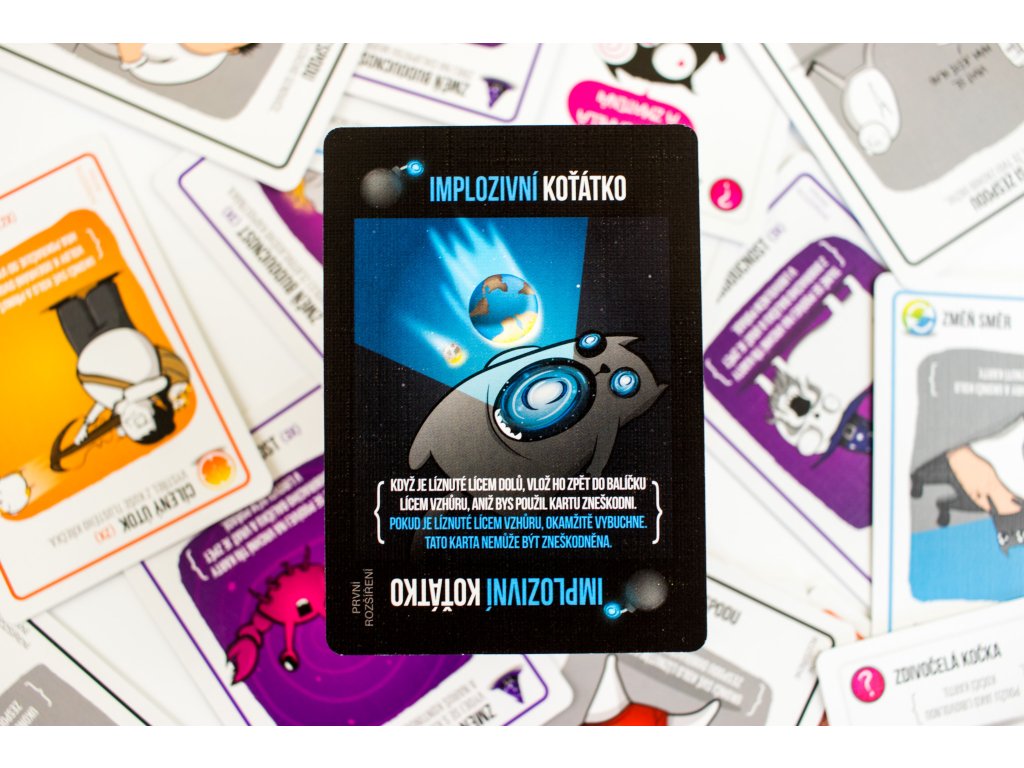 Toto rozšíření nabízí úplně nové druhy karet, které skvěle obohatí vaši originální hru Výbušná koťátka. Naleznete zde například karty s efektem změny směru hry nebo možností pozměnit budoucnost. Čeká na vás také karta Implozivního koťátka - nová šance, jak hanebně umřít a límec hanby, který označí chudáka, který pořádně nesleduje hru. Nejen to vám nabídne první oficiální rozšíření Implozivní koťátka. 20 nových karet v extra velké krabici prostě musíte mít! Díky tomuto rozšíření si hru můžete zahrát až v 6 hráčích!Upozornění! K tomuto rozšíření budete potřebovat alespoň jednu základní sadu Výbušných koťátek (Originální edici, Přisprostlou edici, Párty karty atd.).