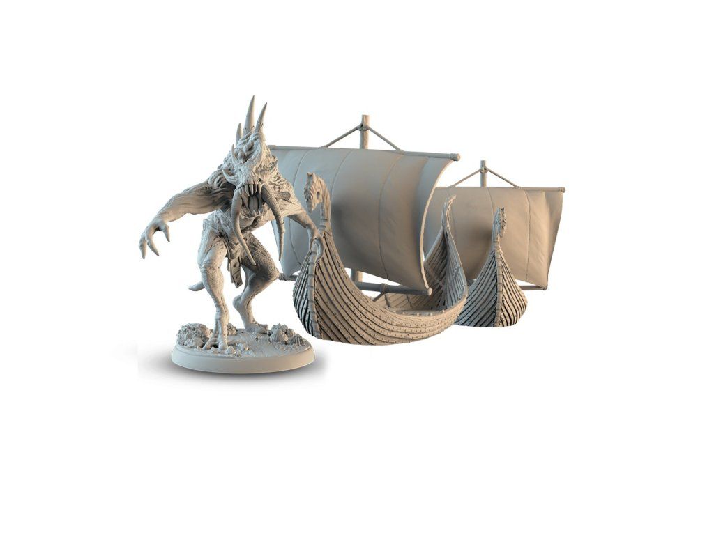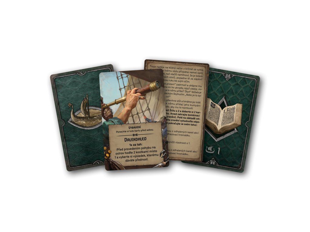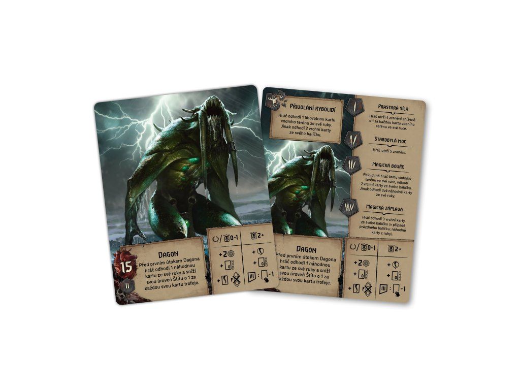 - obsah balení: figurka Dagona, herní plán, 3 figurky lodí, velká karta nestvůry, 14 žetonů, 30 karet událostí, 50 karet průzkumu, pravidla